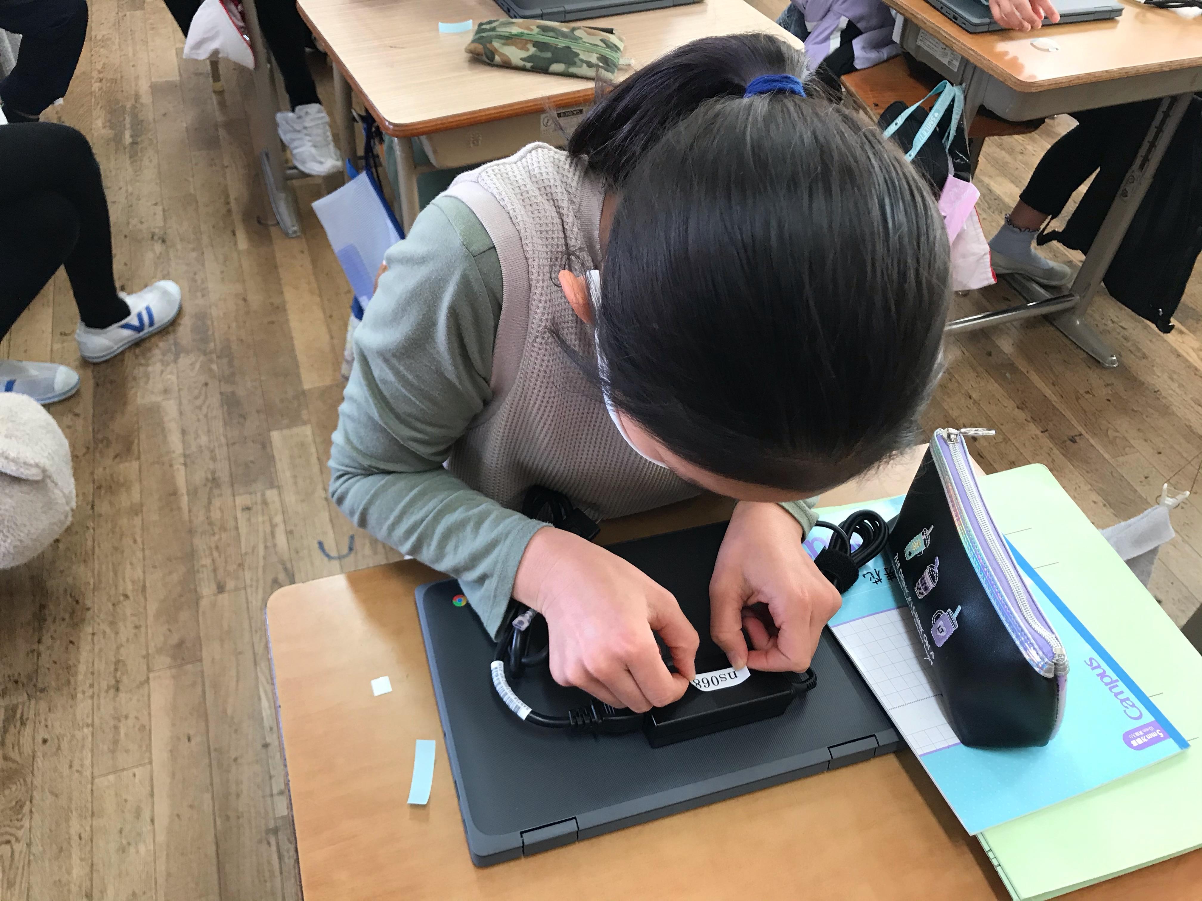 まず、はじめに番号シールを貼り、充電保管庫へ保管する準備を行いました。電源コードを、充電庫にはめていく作業は、かなり手ごわい作業でしたが、試行錯誤しながら、見事に作業が組織化され、一人ひとりが職人となり、丁寧にはめていきました。完成時には、自然と拍手が生まれ、自分たちで作業をすることで、大切にしていく心構えが育まれていくように思いました。