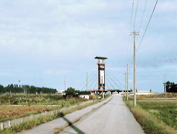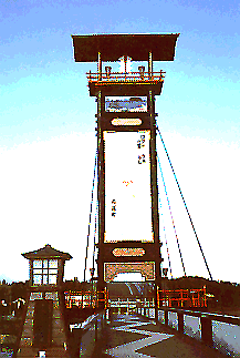 この写真は、北陸地方のある町にある、小規模な斜張橋です。この橋では、地元に伝わるものをデザインした、として、何と、斜張橋のタワーを