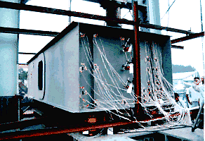 れる桁も増えています。箱桁は、I形の桁よりも力学的に有利なことが多い上、下から橋を見上げた場合の美観という点でもI形よりいいからです。 ところで、局所荷重を受ける腹板のところで説明したように、桁 の支点の部分にはかなり無理な力がかかるので、十分な補強をするなど、そこの設計には、みな、細心の注意を払っています。そして、箱桁で、その補強のため に使われる“部品”が「支点上ダイヤフラム」なのです。写真が、そのダイヤフラム(実験用の模型)です。 ところが、箱桁は、I桁に比べて力学的に有利と言っても、支点ちかくの無理な力が複雑にかかる部分については、そのメカ ニズムはまだ完全には解明されていないのです。 この研究は、支点上ダイヤフラムの強度や箱桁の支点周辺の力の様子を調べ、ダイヤフラムの設計の方法を検討することが目 的です。 |