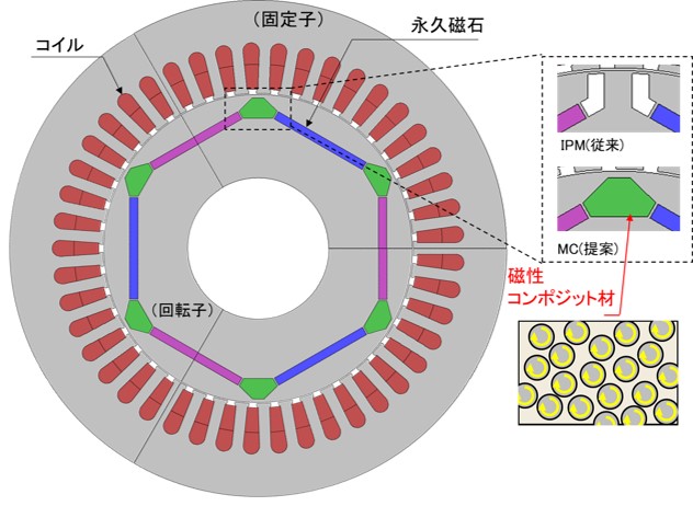 また,リング状に成形した磁性コンポジットを固定子に装着することでギャップ部の空間高調波を抑制し,冷却が難しい回転子の温度上昇を20℃以上低減しています。