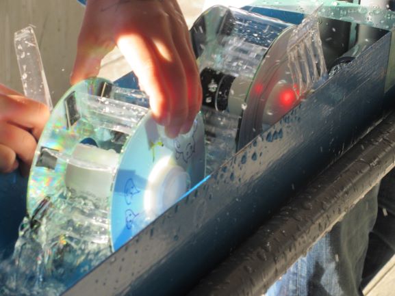 ペットボトルで水車を作製し実際に光らせよう。ちゃんと光ったかな。