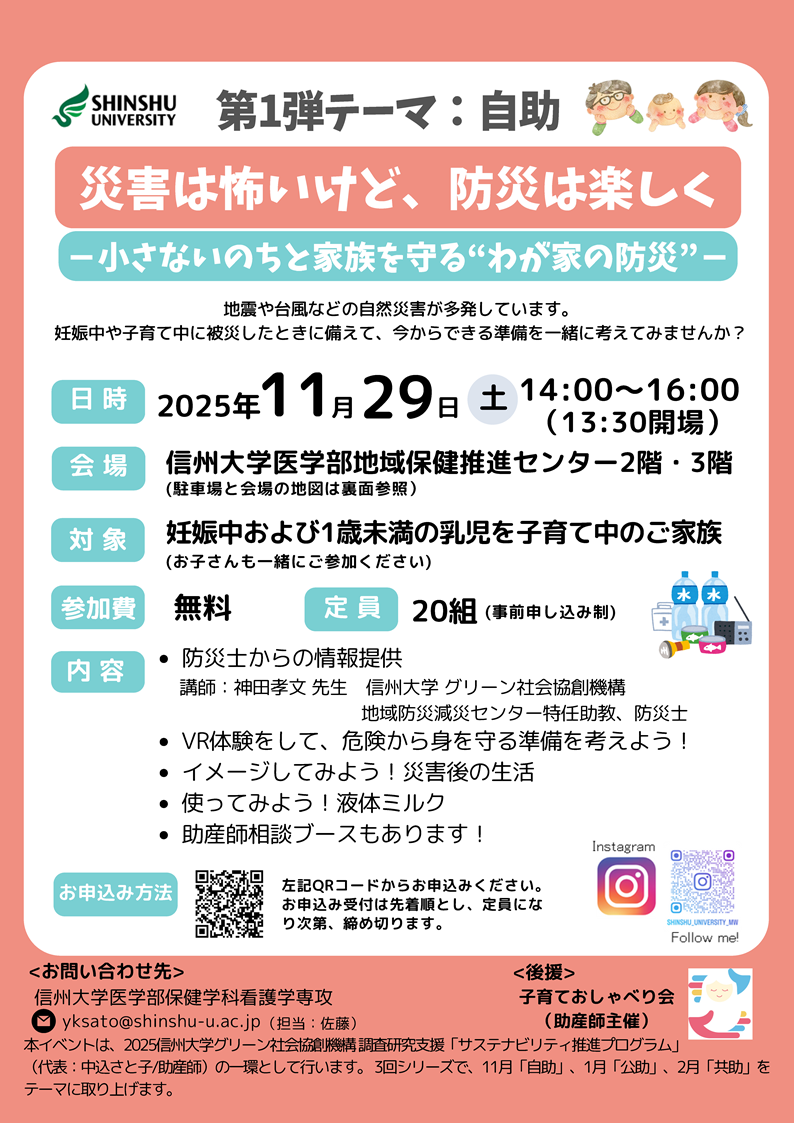 本イベントは、2025信州大学グリーン社会競争機構 調査研究支援「サステナビリティ推進プログラム」(代表:中込さと子/助産師)の一環として行います。