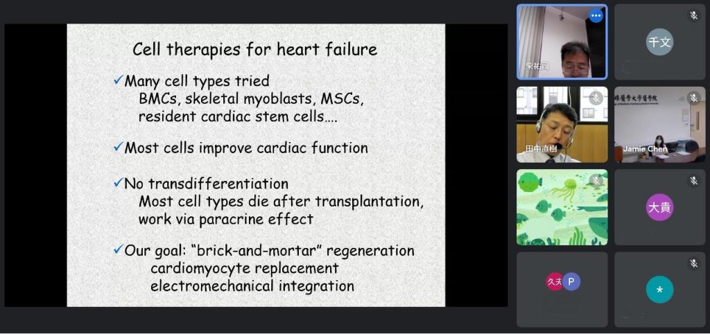 双方医学部の国際交流担当 田中直樹教授とHsiang-Chun Lee教授が司会を務め、両大学あわせて90名ほどの医学生・大学院生・教職員が参加した今回の研究交流会では、両校の大学院生が2名ずつ、現在進行中の研究を発表しました。コメンテーターとして本学部循環器内科学教室の桑原宏一郎教授、再生医科学教室の柴祐司教授、循環病態学教室の新藤隆行教授にも参加いただき、両校の教員・学生は活発に議論しました。