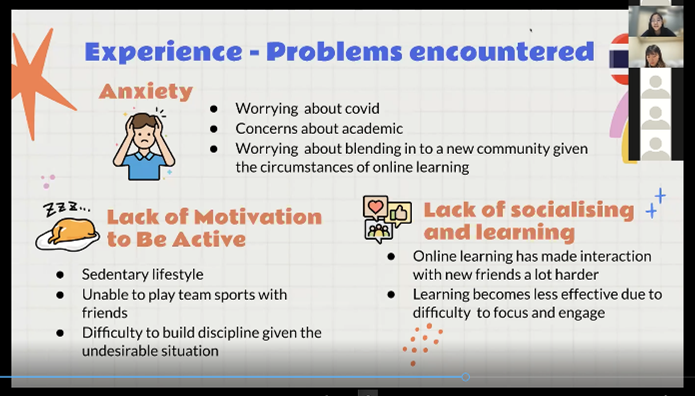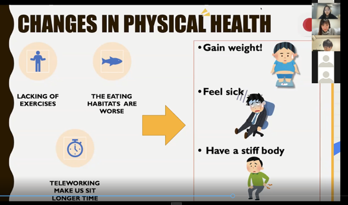 2021年11月8, 15日の両日、本学部80人(グループ2, 3)とタイ マヒドン大学医学部1年生16人が2校混合の12グループに分かれ、「コロナ禍における大学生活の変化」について、特に「Improving online well-being」「Academic engagement」「Student bonding activities」に関して両校での様子を比較し、相互理解を深めました。英語でのコミュニケーションに最初は緊張していた学生も、お互いの文化や日常生活に話が及ぶことで和み、オンライン交流を楽しみました。