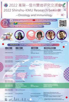 コロナ禍においても海外協定校との連携を絶やさないように、本学部ではICTを活用した国際研究交流を行っています。2022年7月7日、医学部とバイオメディカル研究所の共催により、海外協定校である台湾の高雄医学大学と第三回目のオンライン研究交流会(第13回国際交流セミナー)が行われました。