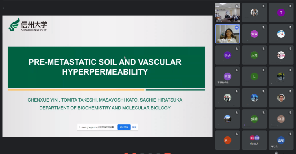 双方医学部の国際交流を担当する田中直樹教授とCho Shih-Feng教授が司会を務め、両大学あわせて80名ほどの医学生・大学院生・教職員が参加しました。高雄医学大学の大学院生2名、信州大学の大学院生1名が、現在進行中の研究を発表しました。平塚佐千枝教授(分子医化学・バイオメディカル研究所)、森政之准教授(加齢生物学・バイオメディカル研究所)、藤井千文先生(分子病理学・バイオメディカル研究所)をはじめ、多くの先生方が参加し、活発に議論しました。