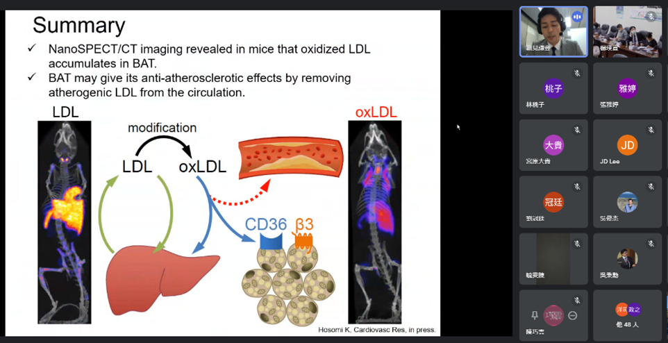 双方医学部の国際交流を担当する田中 直樹 教授とCho Shih-Feng教授が司会を務め、両大学あわせて60名ほどの医学生・大学院生・教職員が参加しました。信州大学からは、Li Ying先生(加齢生物学教室、スーパーバイザー:宮原 大貴 助教)。細見 謙登先生(分子病態学教室、スーパーバイザー:細田 洋司 准教授)が自身の研究成果を発表し、両校の間で活発な議論が繰り広げられました。