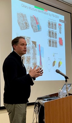 繊毛の異常により生じる様々な疾患を ciliopathy と呼びます。繊毛の形態や形成過程を解析することは、ciliopathy の病態理解に重要です。Westlake 先生は、米国国立衛生研究所(NIH)で繊毛研究に従事されており、本学部乳腺内分泌外科の 伊藤研一 教授とは旧知の間柄です。今回、学会での来日に合わせて、伊藤教授が信州大学に招聘し、今回のセミナーが実現しました。