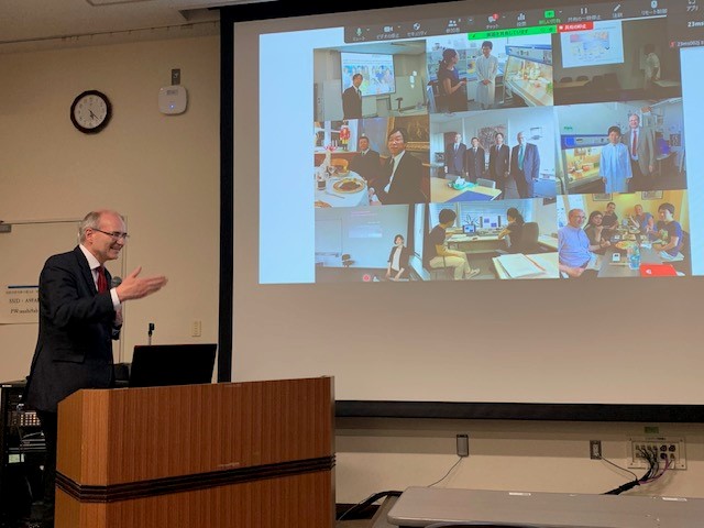 沢村教授の司会により、Morawietz先生に血管内皮細胞での酸化ストレス産生のメカニズムと動脈硬化との関連について、最新の研究成果をご講演頂きました。当日は30名余りの本学学生、大学院生、教職員が集まり、オンラインでも配信されました。冨田 拓郎 准教授(分子薬理学)、森 政之 准教授、藤井 千文 先生(ともにバイオメディカル研究所)をはじめ、多くの研究者や学生から質問が投げかけられ、熱いDiscussionが繰り広げられました。