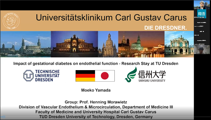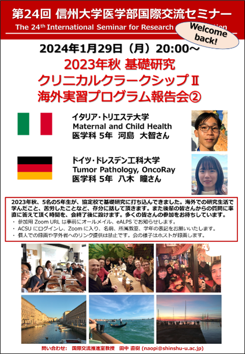 医学科5年生が、2023年8月末から米国・カリフォルニア大学デイビス校に1名、イタリア・トリエステ大学に2名、ドイツ・ドレスデン工科大学に2名派遣され、3か月間の基礎研究実習を行ってきました。5名とも逞しく成長し、多くの事を学んで、無事に信州大学に戻ってきました。2024年1月24日と29日、海外実習生が医学生や教職員に向けて帰国報告を行いました。