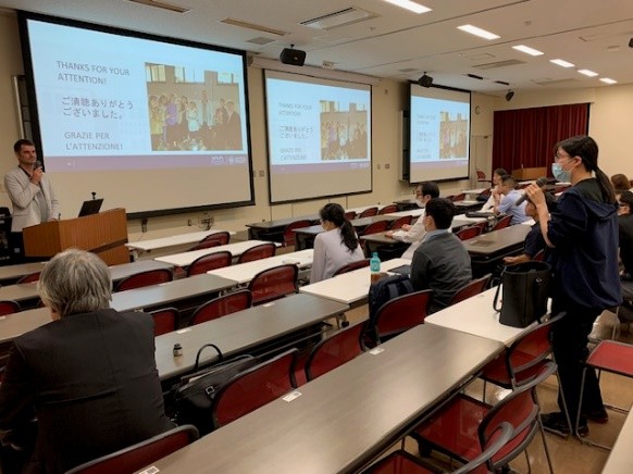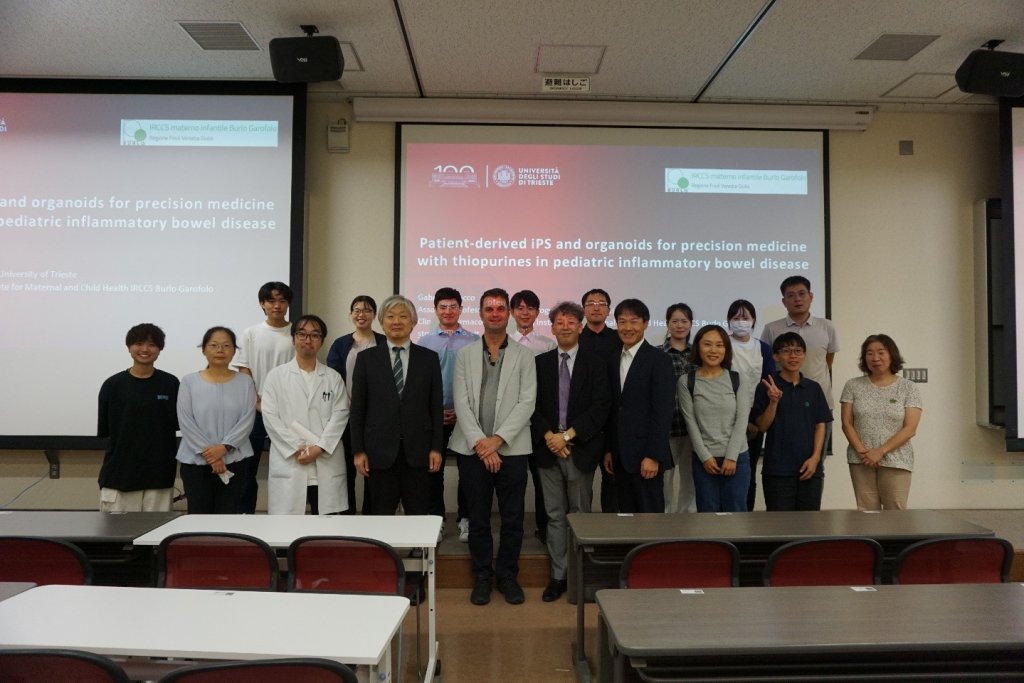 バイオメディカル研究所の齋藤直人所長のご挨拶の後、Stocco先生は、iPS 細胞を用いた薬剤性膵障害、オルガノイドを用いた炎症性腸疾患の病態解析について、最先端の研究成果を分かりやすくお話しくださいました。講演会には約20名の医学生・大学院生、教職員が参加しました。特に、5年生の時にトリエステ大学に留学し、3か月間研究に専念した川瀬伽奈先生(2022年留学)、河島 大智さん、直江 翔吾さん(2023年留学)も、活発に議論に加わってくれました。セミナー後もStocco先生への質問が長く続き、心を開いたリアルな国際交流が行われました。