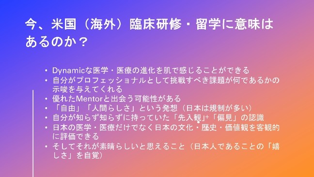 私たちが住む現代社会は、激動する「時代」の要請に応えるべく、著しい変容と進化が求められている。医学・医療の世界もその例外ではない。情報革命による夥しい情報の自由化と共有、人工頭脳 AIを含めた目まぐるしい生命科学・技術の進歩、そして多様なる価値観の共存と許容などにより「時代」は大きく変化したし、これからも更に進化し続けるであろう。このため、最新治療のみならず、「健康」や「疾病」の基本的概念、診断学さえも根本から変わろうとしている。こういった時代のダイナミックな変動は、米国での医療現場では新しい時代の鼓動として日々肌で感じられるものである。この現象は、一見大きな混乱にも見えるが、同時に医学史上において新しい規準 Paradigm が創造される非常に貴重な機会 Opportunity であるとも言える。今こそ人類の叡智が問われている。若い人たちは、この今という時代の持つ特別な重要さ・意義に気づいて欲しい。新しい時代に求められる医師像とは具体的にどのようなものなのか、また今後若い人たちをどのように時代の要請に適うよう養成していくのかは、大学医学部や医療教育機関(そして大人たち)に求められている極めて重要な命題と言えよう。このような背景で、海外臨床研修・留学は、いったい何をもたらしてくれるのだろうか?私の過去35年の米国での経験から、将来の医学界を担う若い人達へのアドバイスと激励の言葉を送りたい。