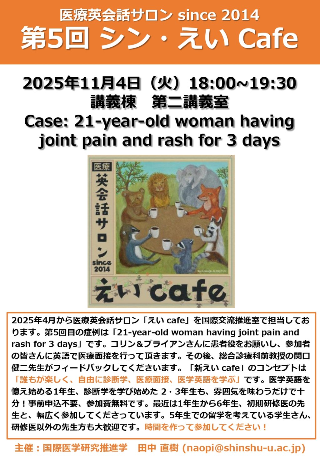 第5回 シン・えい Cafe 開催のお知らせ 2025.10.27 お知らせ 医療英会話サロン 第5回「シン・えい Cafe」を下記の通り開催いたします。 --- 日時:令和7年11月4日(火)18:00~19:30 場所:講義棟 第二講義室 症例:21-year-old woman having joint pain and rash for 3 days ※ 事前申込不要、参加費無料 --- 詳しくは、チラシをご覧ください。 是非お気軽にご参加ください。お待ちしております。 前のページへ 一覧に戻る