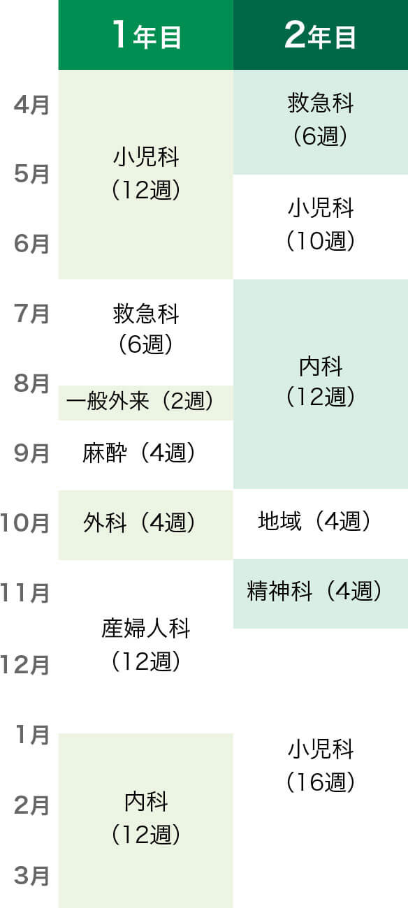 2年間を通して4週以上行います。地域医療または協力型臨床研修病院、研修協力施設の研修中に行い、当院でも補完的に行うものとします。