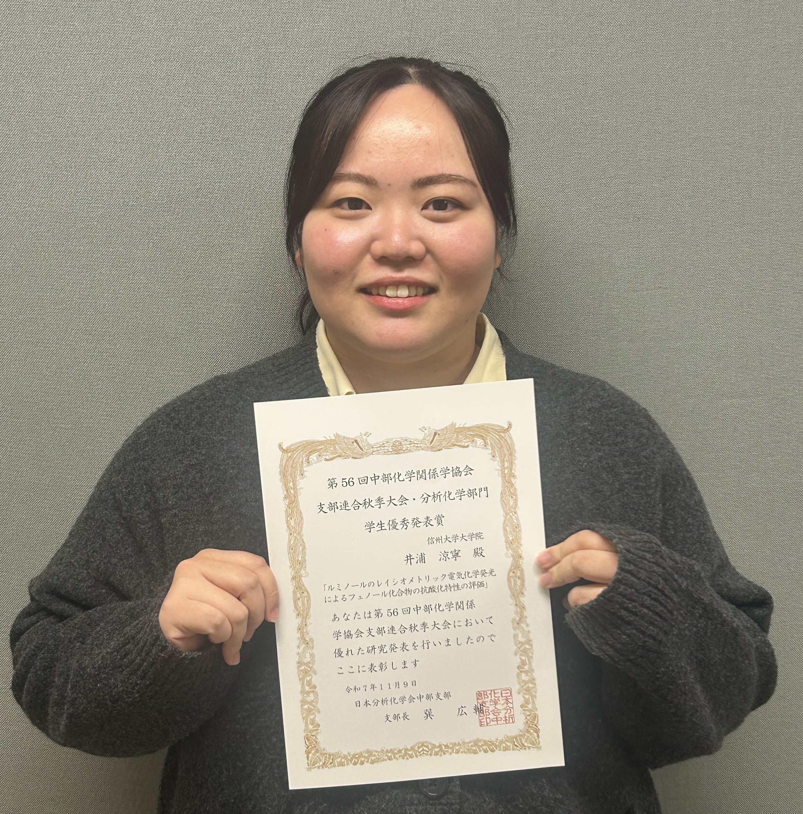 総合理工学研究科修士課程1年の井浦涼寧さん(化学ユニット・金研究室) が、2025年11月8・9日に岐阜大学で開催された第56回中部化学関係学協会支部連合秋季大会において、分析化学部門・学生優秀発表賞受賞しました。受賞題目は以下のとおりです。