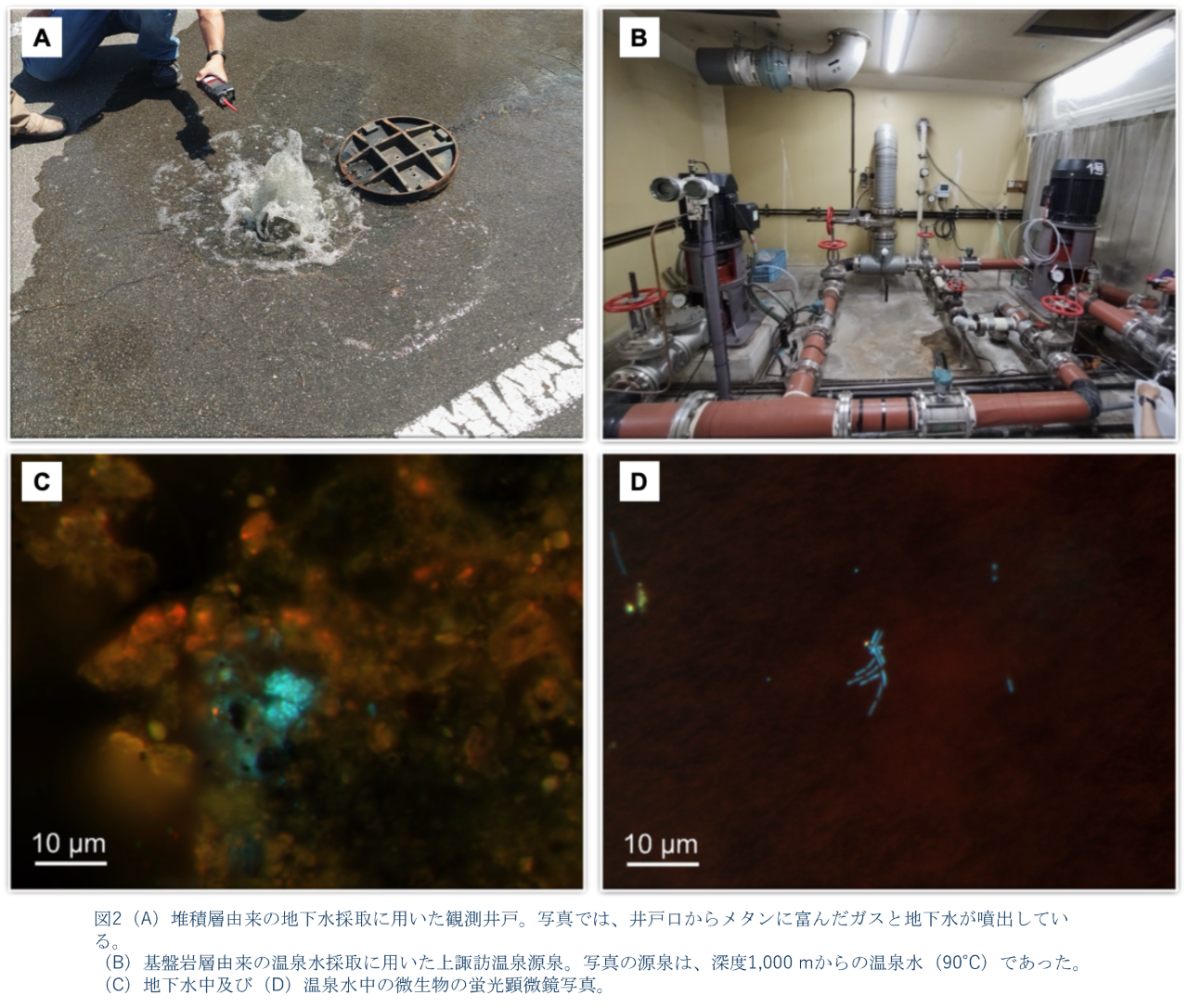 そこで本研究では、地下微生物相の解析と地下水・溶存ガスを対象とした地球化学分析を並行して実施し、諏訪盆地の深部における地下微生物の生態と物質循環とのつながりを解明することを目指しました。