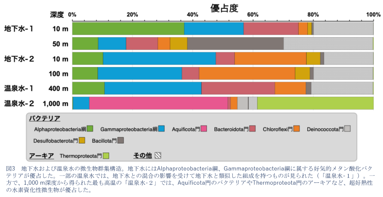※3 水素資化性バクテリア:水素細菌、水素酸化細菌とも呼ばれる。分子状水素(H2)を酸化する反応からエネルギーを獲得し、生育するバクテリア。有機物を必要とせず、独立栄養的に生育することが可能である。本研究では、Aquificota門に属するHydrogenobacter属やSulfurihydrogenibium属が温泉水中の優占系統として認められた。