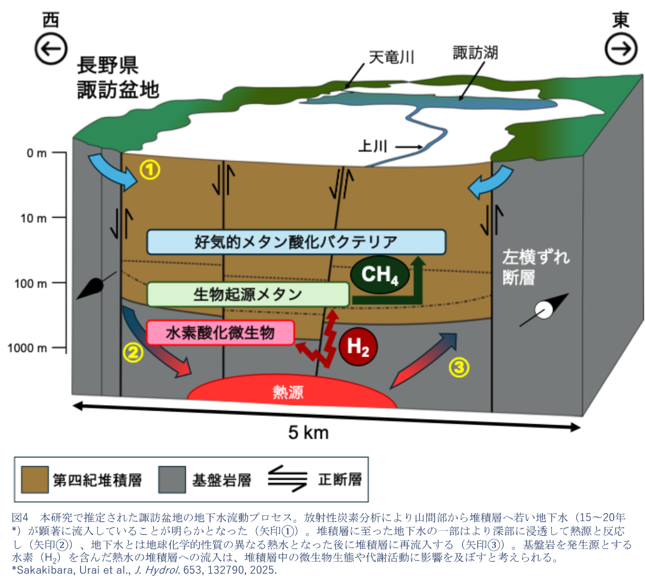 そこで本研究では諏訪盆地の地下水・温泉水を対象に微生物相の網羅的な解析を行い、有機物に富んだ堆積層にはメタンを酸化するバクテリア、熱源を伴う深部の基盤岩層(最大深度〜1,000 m)の温泉水には、水素を酸化してエネルギー獲得を行う水素資化性のバクテリア・アーキア※3,※4が優占することを明らかにしました。また、水循環を規格化する化学トレーサーとして、放射性炭素同位体分析※5を含む溶存成分の精密な化学分析を行い、諏訪盆地における天水(てんすい)※6と地下水の時空間的な流動プロセスを明らかにしました。本成果は、プレート境界での断層活動に伴う地下環境の水素給源と微生物生態との相互作用の理解に大きく貢献するものと期待されます。