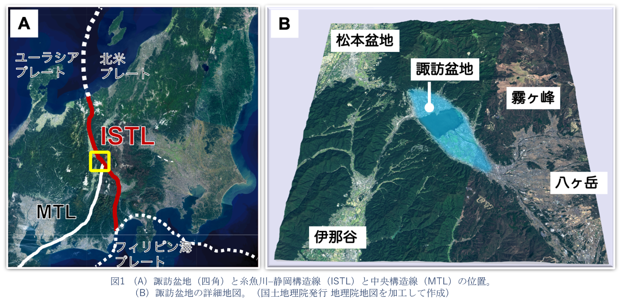※1 糸魚川-静岡構造線(ISTL = Itoigawa-Shizuoka Tectonic Line):北米プレートとユーラシアプレートの境界上に位置する、日本を代表する大断層帯。日本海側は新潟県糸魚川市から、太平洋側は静岡県静岡市までを結び、諏訪盆地はその中点付近に位置する。フォッサマグナ(大地溝帯)の西端としても知られる。
