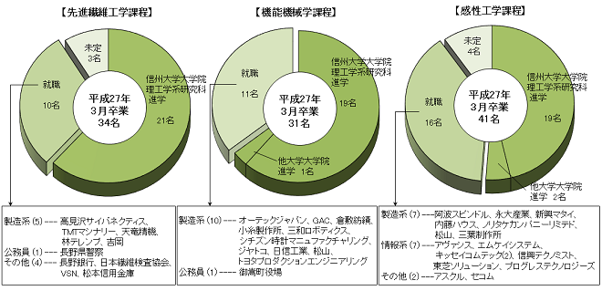 平成26年度、学部4年生から大学院修士課程への総進学率は65.3% (196/300)、内部進学率は93.4% (183/196)、就職を希望する者の就職内定率は89.1% (90/101) でした。 大学院理工学系研究科 修士課程修了生の就職先については、 こちらの一覧表をご覧ください。