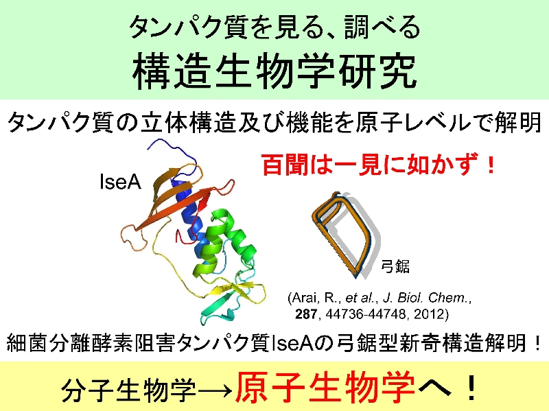 あらゆる生物に必要不可欠な生体分子であるタンパク質を主な研究対象として、「タンパク質を見る、調べる、創る、応用する研究」を精力的に展開しています。主にX線結晶構造解析法によりタンパク質の立体構造を原子レベルで明らかにするとともに、生化学、分子生物学、遺伝子工学的手法を駆使して、タンパク質の構造と機能の詳細を解明することを目指しています。また、タンパク質を創る、応用する研究として「タンパク質工学」研究を行っています。タンパク質を有用な生物資源ととらえ、基礎研究だけでなく、将来的に応用面でも社会に役立てていくことを目指して、タンパク質を変異・改良する研究や、人工タンパク質をデザイン・創出する研究に取り組んでいます。