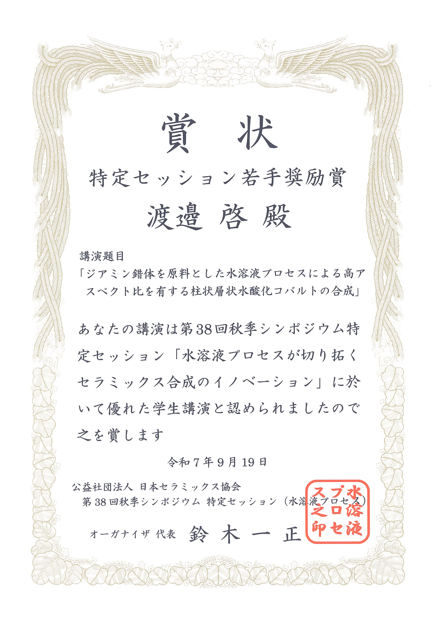 2025年9月17日~19日、群馬大学にて開催された日本セラミックス協会 第38回秋季シンポジウムにおいて渡邉 啓さんが発表し、特定セッション若手奨励賞を受賞しました。おめでとうございます!