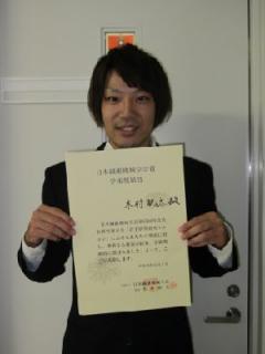 本学大学院理工学系研究科先進繊維工学コースの木村航太さんが、平成24年6月1日~2日に大阪科学技術センターにて開催された第65回日本繊維機械学会において、「運動効果向上のためのトレーニングインナーウェアの設計」と題して研究成果を発表し、日本繊維機械学会学術奨励賞を受賞されました。