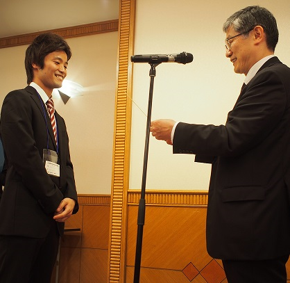 大学院理工学系研究科 化学・材料専攻 応用化学コース2年の渡邊 拓巳さん (鈴木 大介 研究室) が、6月8~10日にタワーホール船堀で開催された平成28年度繊維学会年次大会 (ホームページ) において若手ポスター賞を受賞しました。 受賞題目は「シード乳化重合によるラズベリー型複合ゲル微粒子の創製」です。近年、真球状粒子とは異なる性質を示すことから、異形構造を有する高分子微粒子に注目が集まっています。そのような中、水で膨潤し、ソフトな性質を有するヒドロゲルと硬質ポリマーであるポリスチレンから構成される複合ゲル微粒子の創製に関する研究を展開しています。本発表は、そうして得られる複合ゲル微粒子の構造制御に関する内容です。なお、本賞は博士号を持たない30歳未満の学会員による応募ポスター演題から選考され、今年度は138件の中から10件が受賞しました。