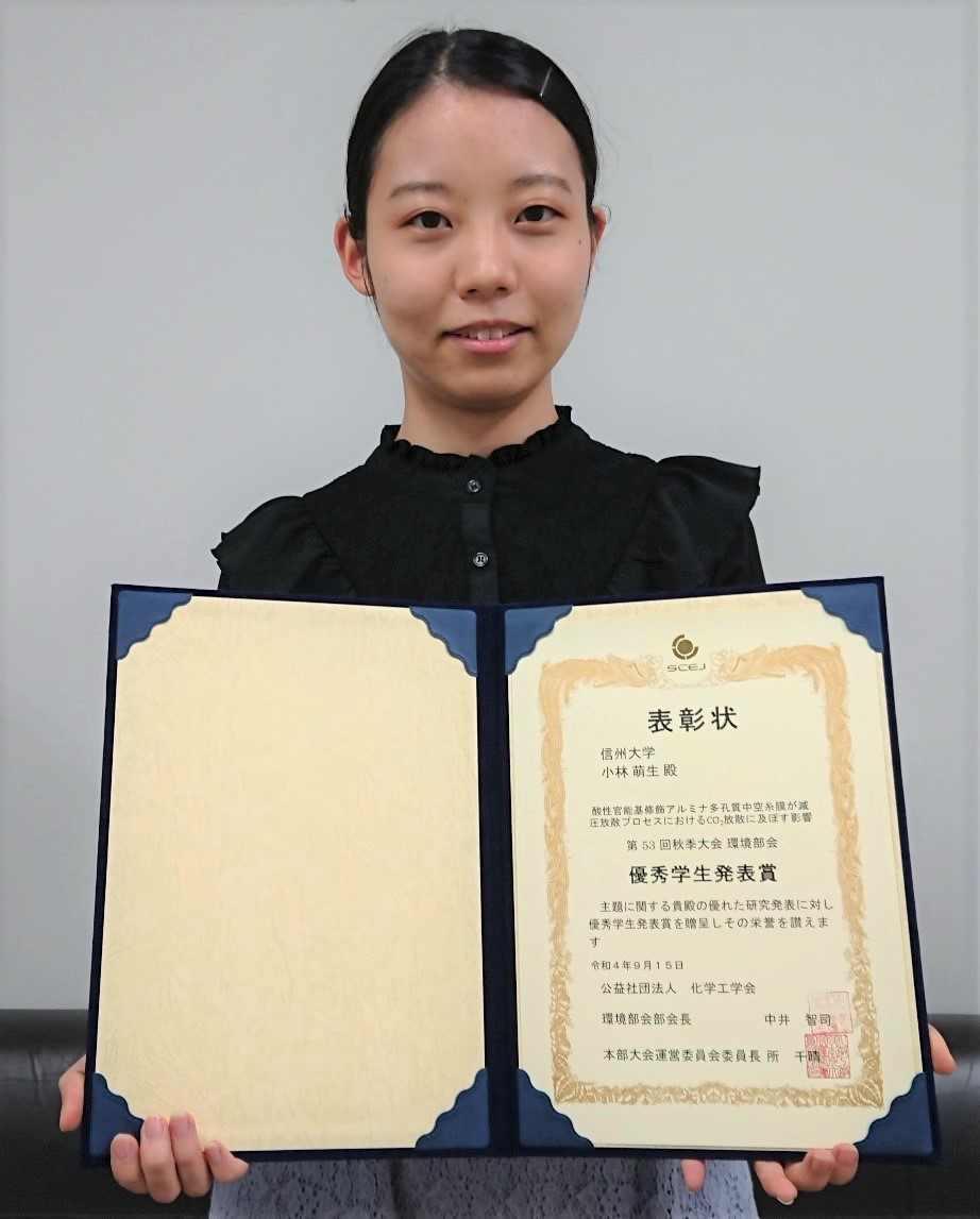 9月14~15日に信州大学とオンラインで開催された化学工学会第53回秋季大会 環境部会シンポジウムにおいて、大学院総合理工学研究科 繊維学専攻修士課程2年の小林 萌生さん(髙橋伸英研究室)が、優秀学生発表賞を受賞しました。今回は学生発表対象者23名のうち、最優秀学生発表賞1名、優秀学生発表賞3名が選ばれました。