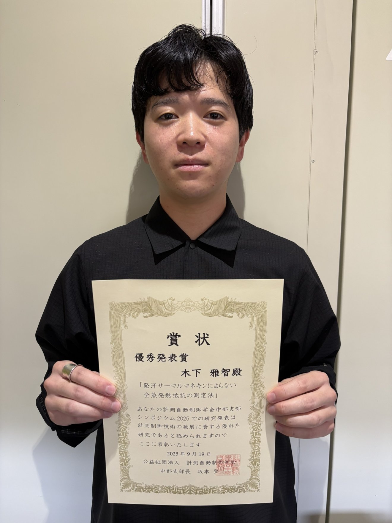 木下さんのコメント:この度、計測自動制御学会中部支部シンポジウム2025において、優秀発表賞を受賞し、大変光栄に思います。私自身が一から立ち上げた研究を高く評価頂いたこと、とても励みに感じますが、同時に先生方や仲間からの支えがあったことを一番に心に留めたいです。今後はこの測定法をさらに発展させ、他の研究者の研究にも貢献できる手法にできるよう、より一層研究に注力して参ります。