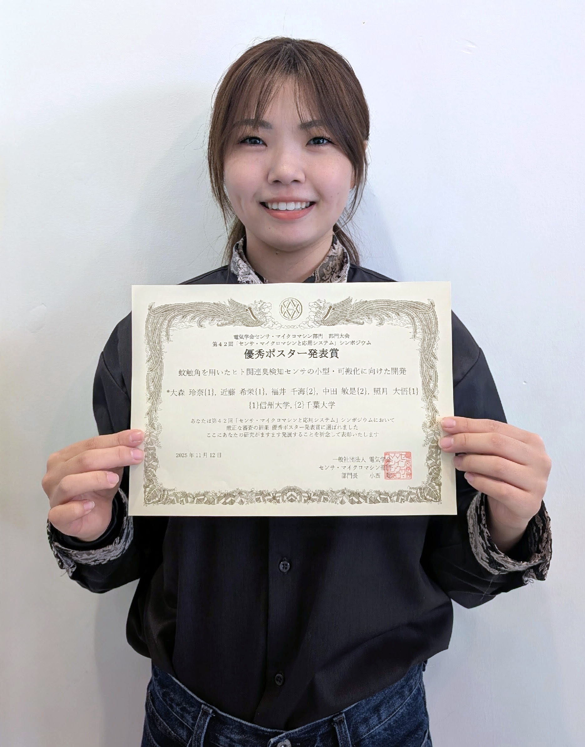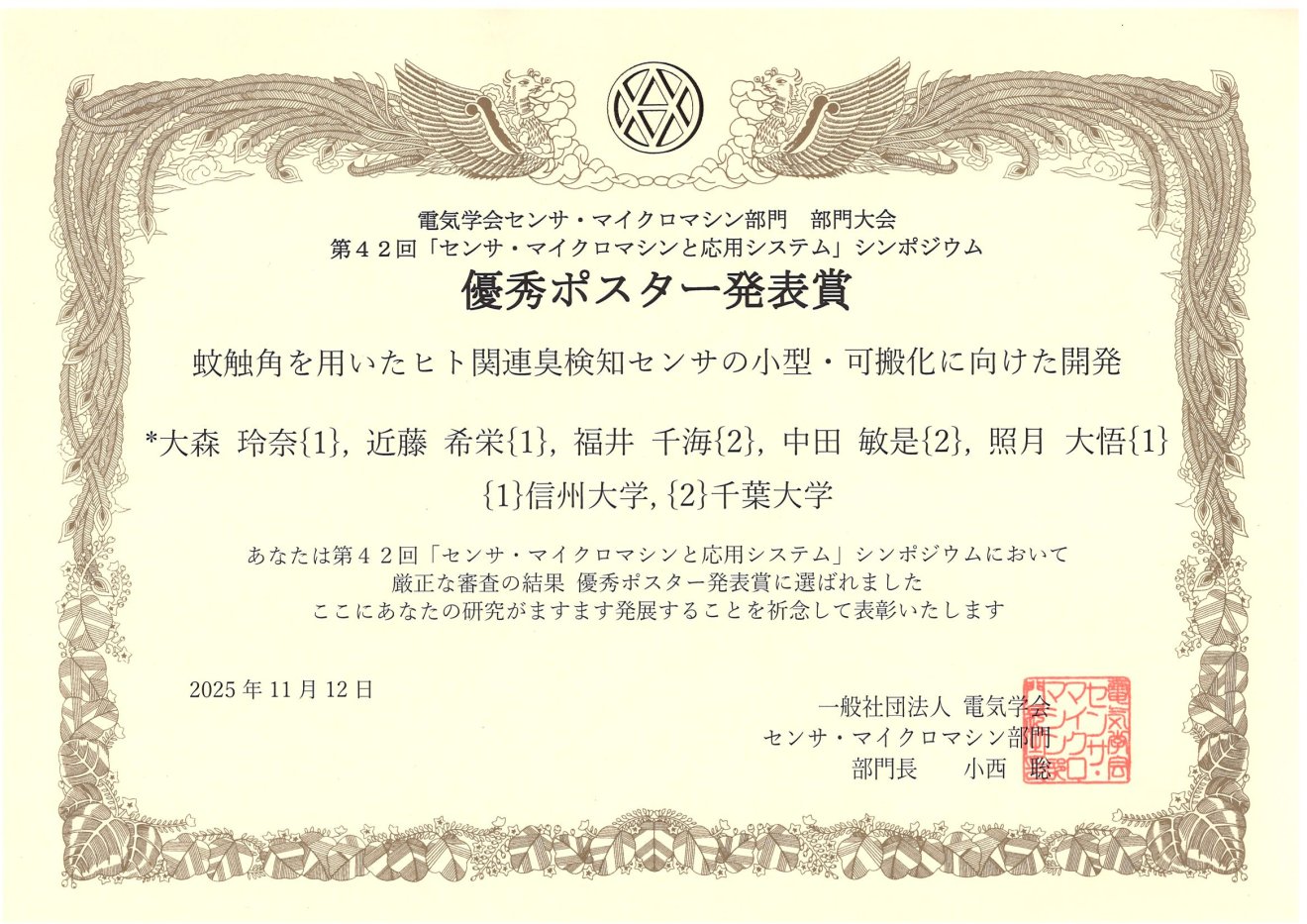コメント:この度は、第42回「センサ・マイクロマシンと応用システム」シンポジウムにおいて、優秀ポスター発表賞をいただき、大変光栄に思います。ご指導いただいた照月先生をはじめ、研究に関わった皆様に感謝申し上げます。本研究を通して、蚊の触角を利用したヒト関連臭検知センサ、ならびに匂いでヒトを探すことができるロボット開発に努めてまいります。