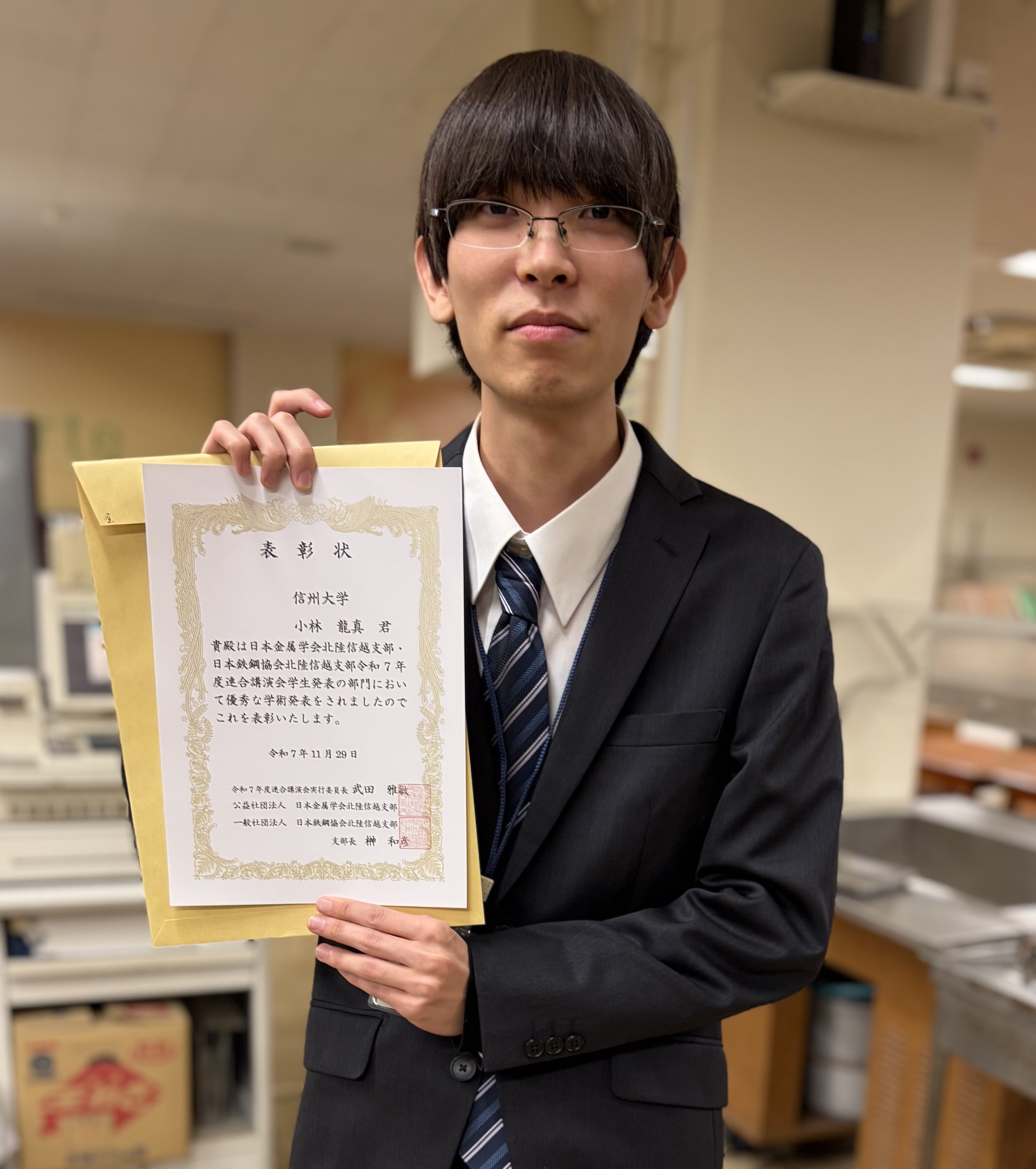 2025年11月29日に長岡技術科学大学にて開催された日本金属学会北陸信越支部・日本鉄鋼協会北陸信越支部 令和7年度連合講演大会にて、小林龍真さん(M2)が口頭発表を行い、約100件の学生発表の中から10件に授与される優秀発表賞を受賞しました。