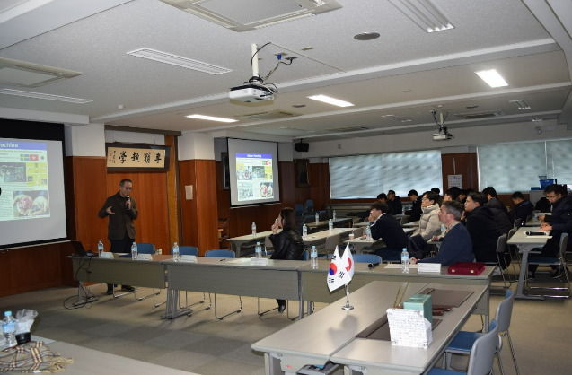 署名式には,Han Jonghun全南大学工学部長およびCHAN Min Cheol, LEE Wonoh副学部長をはじめとする計25名が来訪し、本学からは村上泰 繊維学部長、小林俊一 国際交流推進室長、金慶孝 教授、繊維科学研究所 Lee Ji Ha 准教授、グローバル化推進センターのJustin Barrera講師など、関係教職員が出席しました。式では、協定書への署名のほか、両大学の紹介が行われました。