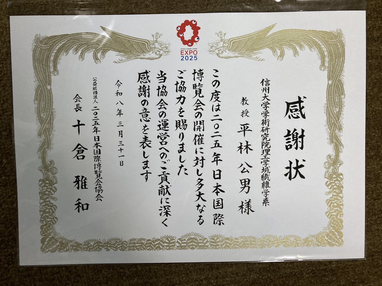 大阪・関西万博の会場において発生したユスリカの大量飛来問題への対応において、本学副学長でありユスリカ研究の専門家である平林公男教授(学術研究院(繊維学系))が中心的な役割を果たし、このたび公益社団法人2025年日本国際博覧会協会より感謝状が贈呈されました。
