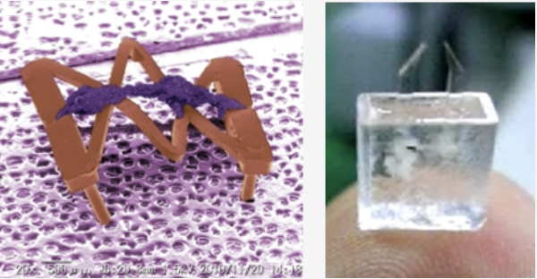 昨今、私達の周囲では様々な用途のロボットが数多く活躍していますが、その多くはモーターによって駆動されています。機械・ロボット学科の秋山 佳丈 准教授は、ロボットなどを動かすために生体の筋肉を利用する技術を開発しています。筋肉は、糖 (グルコース) を燃料として直接運動を生み出すことが出来るため、高効率かつ化石燃料に依存しない機械システムの構築が可能になります。これまでに昆虫の筋肉使って、世界初の室温で自律的に移動するマイクロロボットや大気中で駆動可能なマイクロピンセットを実証しました。(写真左:マイクロロボットの電子顕微鏡像、写真右:指の上で駆動するマイクロピンセット)