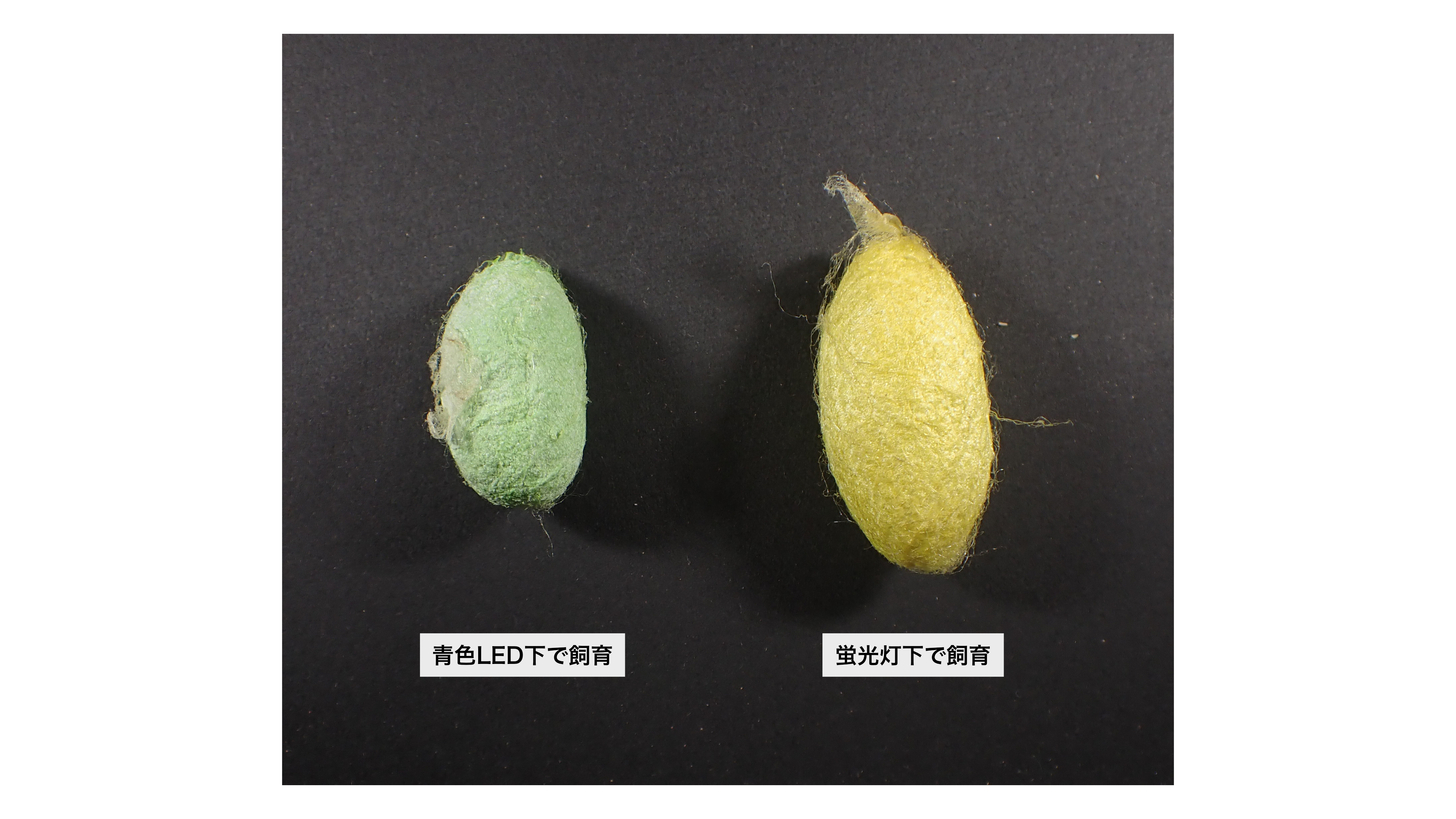 天蚕糸を作る目的で飼育されるヤママユガは、屋内で飼育すると黄色の繭をつくり、屋外(あるいは青色LEDの下)で飼育すると緑色の繭を作る。しかし、そのメカニズムは未解明である。 |