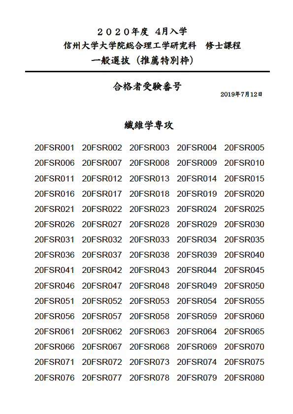 2020年度4月入学 繊維学専攻 一般選抜 (推薦特別枠) 合格発表