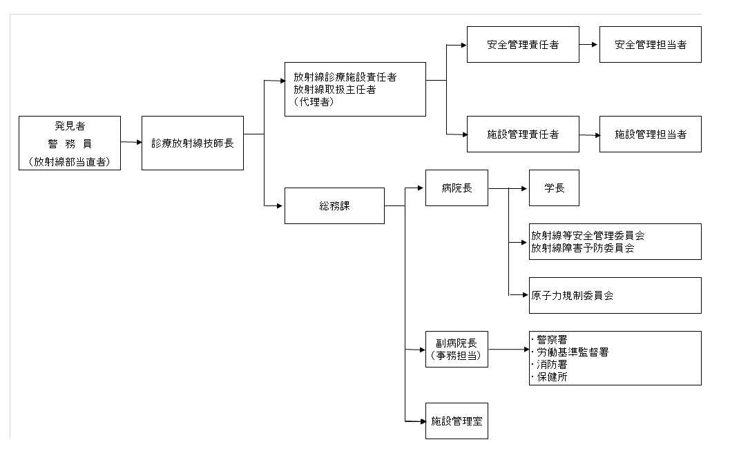 3 病院長は,前項の報告を受けたときは直ちに放射線障害の発生又は拡大を防止するために必要な措置を講じた上,状況に応じて所轄の警察署,労働基準監督署,消防署又は保健所等の関係機関に通報するとともに学長に報告しなければならない。