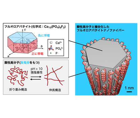 This research mimics the biological mechanism by which biominerals (Note 3) such as teeth and bones are formed. By controlling the stereostructure of an acidic polymer to mimic the function of proteins, they achieved the synthesis of high-aspect-ratio (Note 4) fluoroapatite nanofibers in a mild aqueous environment.