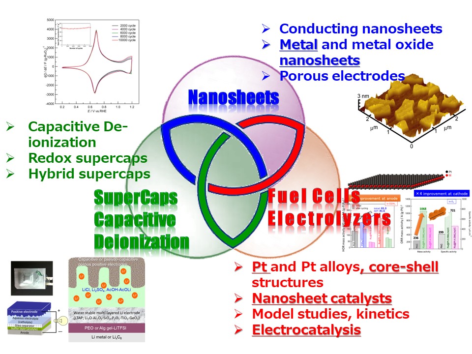 Research of this Unit focuses on the development of new inorganic nanomaterials and novel synthetic processes. We strive to contribute to the prompt realization of hydrogen economy and low-carbon society. Particular emphasis is placed on the development of novel two-dimensional materials—nanosheets— targeted for practical applications such as supercapacitors and batteries, hydrogen fuel cells, water electrolyzers, desalination, etc.