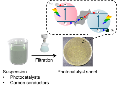 The aforementioned Z-scheme photocatalyst sheet requires vacuum and calcination processes, making it difficult to apply non-oxide photocatalyst materials with low heat resistance or to scale up the system. Our laboratory found that a Z-scheme photocatalyst sheet that drives the water splitting reaction can easily be produced by filtering a suspension of HEP, OEP, and carbon-based conductive materials. Despite the simplicity of the required equipment and processes, the photocatalyst sheet produced by filtration split water and produce hydrogen with an energy conversion efficiency of 0.4%. These achievements have already been showcased at the 2025 Osaka-Kansai Expo and will pave the way for large-scale applications of long-wavelength photoresponsive photocatalysts.