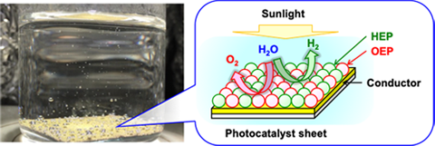 It is possible to split water into hydrogen and oxygen using two-step photoexcitation by combining hydrogen evolution photocatalysts (HEPs) and oxygen evolution photocatalysts (OEPs). Such photocatalytic systems are called Z-scheme systems after the photoexcitation process of natural photosynthesis. In our laboratory, we applied the particle transfer method, a method to fabricate particulate electrodes with low contact resistance, to prepare Z-schematic water-splitting particulate photocatalyst sheets in which HEPs and OEPs were blended and fixed on a thin film of conductive material. A photocatalyst sheet based on La,Rh co-doped SrTiO3 as a HEP and Mo-doped BiVO4 as an OEP immobilized on an Au thin film exhibited high water-splitting activity even in pure water. Notably, the photocatalyst sheet could maintain the water-splitting activity even when they were expanded to a large area, because evolution of hydrogen and oxygen occurred in close proximity, and the influence of solution resistance and mass transfer resistance could be minimized. In addition, we found that the excellent water-splitting performance was maintained even under atmospheric pressure, which was assumed to be practical conditions, when materials effective in preventing reverse reactions were applied. The solar-to-hydrogen energy conversion efficiency at the atmospheric pressure reached 1.0%, the highest ever reported using particulate photocatalysts. We will continue to develop photocatalyst sheets for water splitting using non-oxide photocatalyst materials, aiming for effective use of visible light with longer wavelengths.