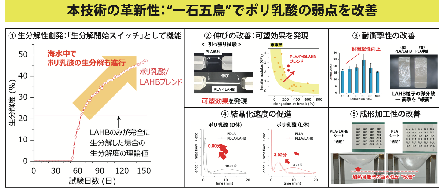 We have demonstrated that LAHB functions as a modifier to overcome these weaknesses of PLA. Remarkably, adding only a small amount of LAHB to PLA improves processability and impact resistance, while also enabling biodegradability in marine environments. This breakthrough overturns the conventional belief that “PLA does not degrade in the ocean,” and paves the way for PLA to evolve into a tougher and more environmentally compatible material.
