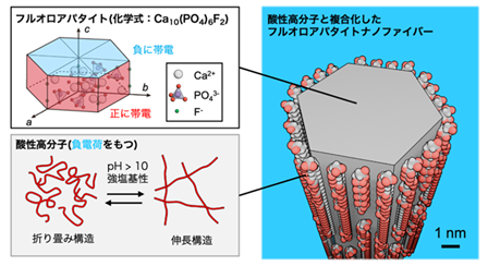 東京大学大学院工学系研究科の三上 喬弘 大学院生、加藤 利喜 特任研究員(研究当時、現:岡山大学 学術研究院先鋭研究領域(異分野基礎科学研究所) 助教(特任))、加藤 隆史 教授(研究当時、現:東京大学名誉教授、岡山大学学術研究院先鋭研究領域(異分野基礎科学研究所) 教授(特任)、信州大学アクア・リジェネレーション機構 特任教授)らの研究グループは、福岡工業大学工学部の宮元 展義 准教授と共同で、強靭なサメの歯の無機成分であるフルオロアパタイト(注1)を主成分としたナノ繊維材料(注2)の水中における温和な条件での合成に成功しました。本研究は、生物の歯や骨などのバイオミネラル(注3)が形成される際の生体の仕組みに倣ったものです。すなわちタンパク質の働きを模倣し、酸性高分子の立体構造制御によって高アスペクト比(注4)のフルオロアパタイトナノファイバーの温和な水中環境下においての合成を実現しました。さらに表面に複合化した酸性高分子の静電反発力によって水中で安定なコロイド(注5)状態として存在し、ある濃度以上で自発的に秩序構造を形成する液晶性(注6)を有しています。また、液晶性を利用することで特定の方向に強いなどの異方的な構造を有するナノコンポジットゲル(注7)へと展開できることも実証しました。