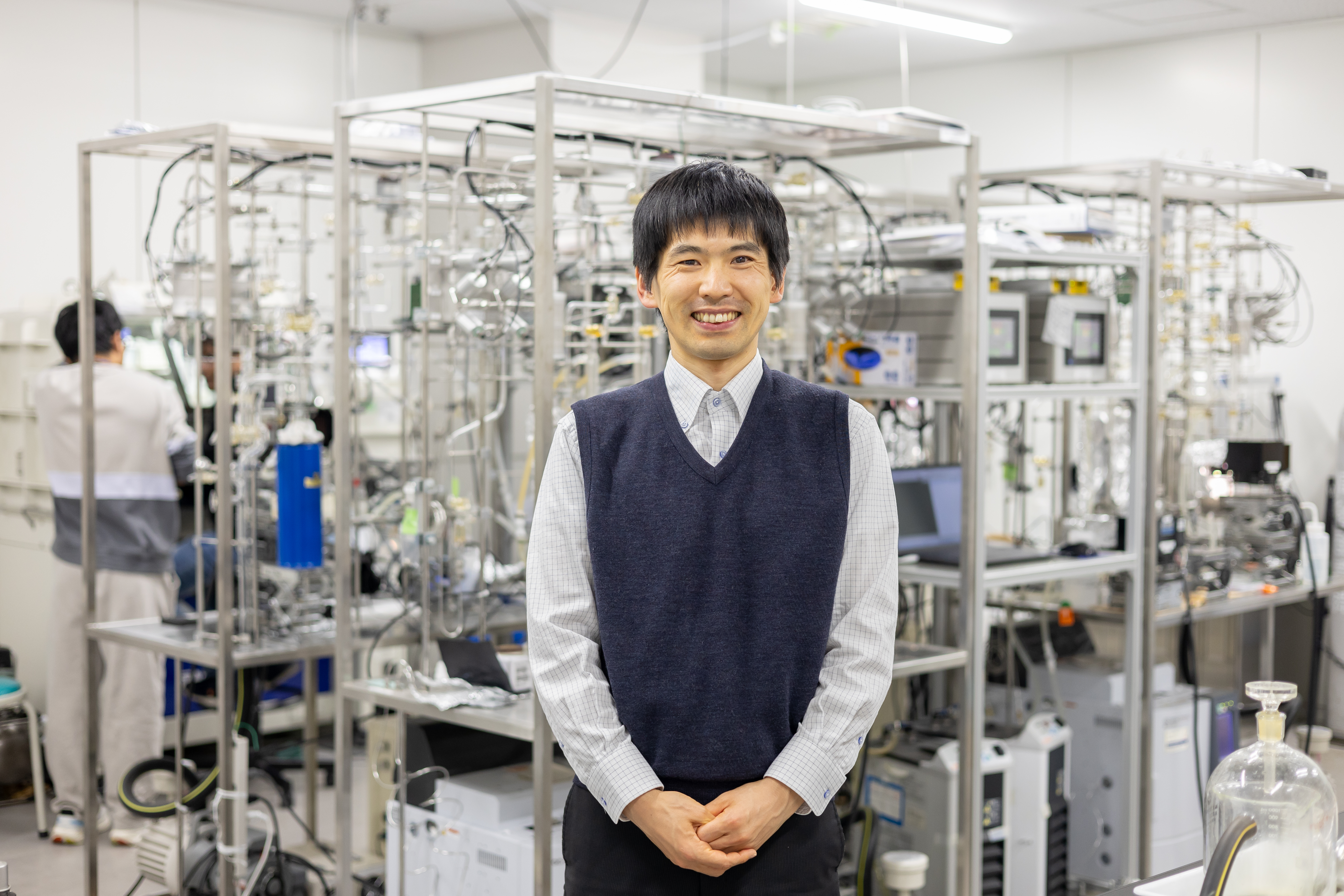 当研究室では、水分解用粉末光触媒の大規模展開を視野にパネル反応システムの開発を進めています。先述のAlドープSrTiO3光触媒は基材上に塗布することで容易にシート状に加工できます。この光触媒シートをパネル反応器に格納すると、水深がわずか0.1mmでも持続的に水を分解し、生成気体を滞りなく輸送できることが確かめられています。2019年からは、東京大学堂免研究室と共同で、大面積の水分解パネル反応システムの建設に着手し、光触媒パネルや付帯設備の動作を長期的に試験しています。100 m2の受光面積を持つ光触媒パネル反応器と分離膜を内蔵したガス分離モジュールから構成される反応システムは、屋外環境でおよそ1年継続して水を分解しました。また、連結したガス分離モジュールを用いることで、生成した水素酸素混合気体から水素ガスを95%の回収率で96.5%の濃度で分離できました。さらに、ガス分離モジュールにガス流量を自律制御する機構を設けることで、日照条件によらず安定したガス分離性能を維持できることも確かめられました。現在、光触媒パネル反応器の低コスト化と大規模化、ガス分離プロセスの分離性能とエネルギー効率の向上のための技術開発を進めています。また、長野県飯田市で5000 m2の土地を利用して、国内最大級の光触媒による水素製造の実証試験を行う予定です。