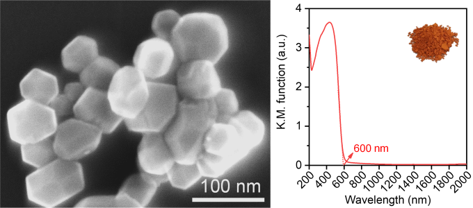 GaNとZnOの固溶体(GaN:ZnO)は、GaNもZnOも紫外光しか吸収しないにもかかわらず、可視光を吸収し、ZnO濃度の増加に伴い吸収端波長が長くなるという興味深い性質を示します。従来、GaN:ZnOはアンモニア気流下での加熱窒化により合成されてきました。しかし、窒化中にZnO成分が還元・揮発するため、高活性化に必要な良好な結晶性と長波長の可視光の吸収に必要な高いZnO濃度を両立したGaN:ZnOを合成することができませんでした。当研究室では、GaN:ZnOの原料と固体窒素源を真空封管中で反応させることで、ZnO濃度が高く、結晶構造を反映した六角柱状のGaN:ZnO単結晶微粒子を合成できることを見出しています。得られたGaN:ZnOは、高いZnO濃度を反映して、吸収端波長が従来のGaN:ZnOよりも100 nm近く長い600 nmに達し、可視光水分解活性を示しただけでなく、約12%の外部量子効率で可視光酸素生成反応を駆動しました。