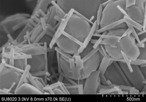 Gd2Ti2O5S2は、上述のY2Ti2O5S2と同様、層状ペロブスカイト型構造を有する酸硫化物であり、波長640 nmまでの可視光に応答する光触媒材料です。当研究室では、合成法や表面修飾法の検討を通じて、Gd2Ti2O5S2の水素生成活性を大幅に向上させることに成功しました。フラックス法を用いてGd2Ti2O5S2を合成後、酸によるエッチング処理を行うことで、原子配列が再表面まで秩序だった板状の単結晶粒子が得られます。この状態から、マイクロ波加熱法と光電着法を駆使して助触媒を担持することで、水素生成反応を波長420 nm で30%の外部量子効率で駆動することが可能になりました。同様の光触媒調製法はSm2Ti2O5S2にも適用可能であり、種々の高活性酸硫化物光触媒やそれを用いた光触媒シートの開発に活用されています。