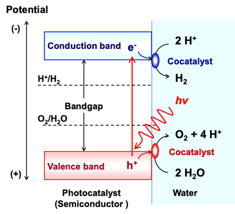 グリーン水素の製造技術として太陽光水分解が研究されています。当研究室では、この技術の実用化に向け、粉末光触媒と反応システムを研究しています。ここで用いられる光触媒は半導体であり、光を吸収することで励起状態の負電荷をもった電子と正電荷をもった正孔が発生し、それらにより酸化還元反応が引き起こされて水が分解されます。粉末光触媒を利用したシステムは、構成要素が比較的単純であり、安価なプロセスで大面積化できる可能性があります。そのため、太陽光水分解反応に高活性な光触媒を開発することができれば、実用レベルの大規模水素製造に向けて大きく前進します。