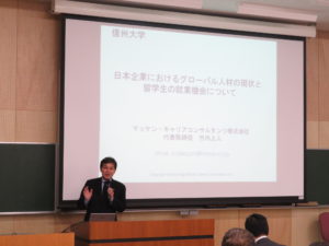 2018年1月21日(月)松本キャンパスにて第三回コンソーシアム企業セミナー を開催しました。前回のセミナーアンケートで「留学生のなまの声を聞きたい」と言う要望に応えて、 今年内定をもらった現役の留学生3名と現在は働いているOBの留学生2名が発表いたしました。 その後に留学生と企業の質疑応答があり盛り上がったセミナーになりました。