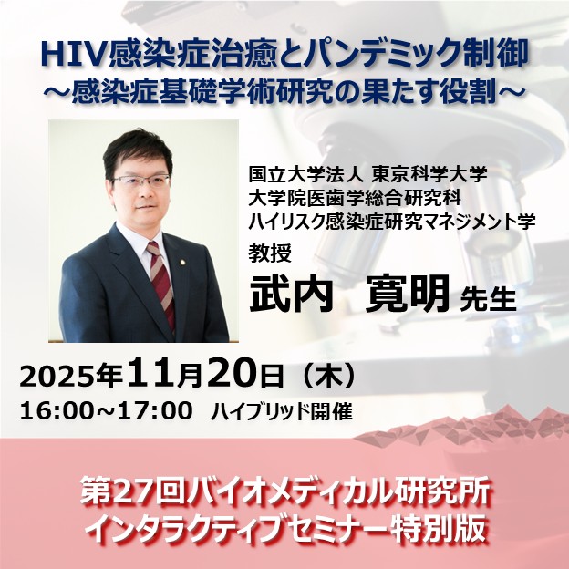 今回は東京科学大学の武内寛明先生による「HIV感染症治癒とパンデミック制御〜感染症基礎学術研究の果たす役割〜」の講演です。講演は全ての教員・研究者・大学院生に公開いたします。